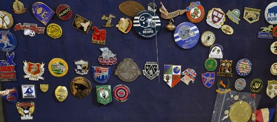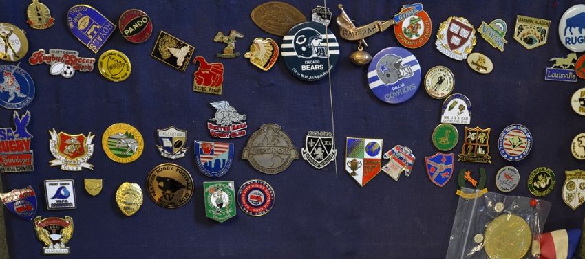 America Rugby Related Pin Badge selection mostly enamel, featuring 51 states, Disney sponsors, San Diego police department, Harvard, 1978 Grand Rapids RFC, 1964 Kansas City, 1969 Houston Rugby Club, 1989 Savannah GA, 1977 Hornets, Los Angeles, 1967 Denver Barbarians, 1977 Mars, 1960 Boston RFC, 1979 Connecticut, Golden Oldies badges, 1986 Scotland Tour ERU Colonials and many other interesting badges, general condition is good, worth inspecting (#280)