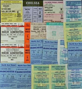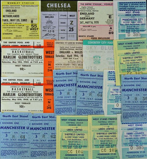 Selection of football match tickets to include 1971 York City v Southampton/Bristol City (FAC), Leeds Utd v Spurs v Manchester City 1972 v Coventry City 1972, Sheffield Utd 1972, Derby County 1972, Manchester Utd, Coventry City v Spurs 1985/86, England Schools v Wales 1969, v Germany 1970, Harlem Globetrotters 18 May 1968, Chelsea v Leeds Utd 1969/70, England v Netherlands 1982, Newcastle Utd FA Cup 3rd Round (no season), duplication noted (44)