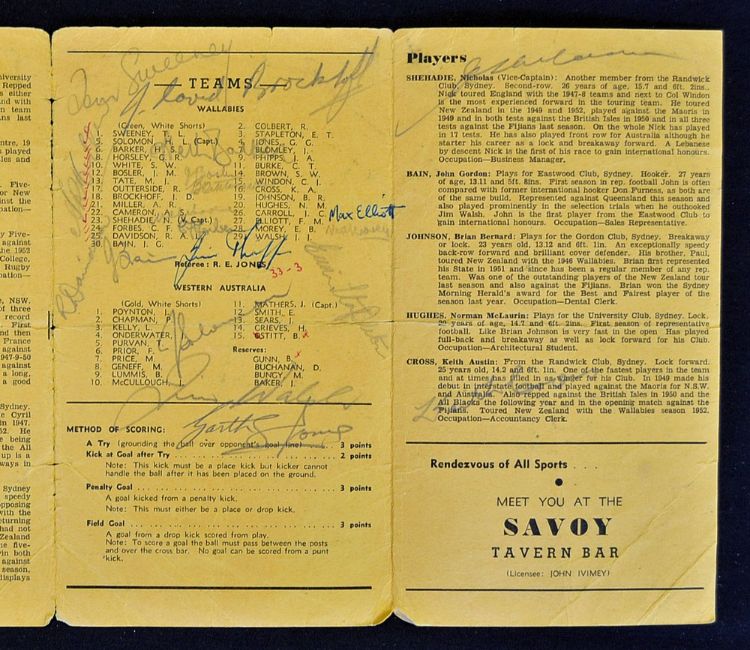 1953 Australia "World Famous Wallabies" versus Western Australia signed rugby programme - single folded sheet the match played at East Fremantle Oval on Sunday 4th October and signed by 22 Wallabies players - card shows some sign of wear, nicks to edges, small tears and pocket folds - still quite clean nevertheless scarce
