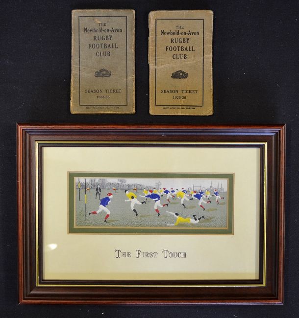 Replica rugby silk Stevengraph - titled "The First Touch" ltd ed no 1526/2000 woven by J&J Cash Ltd, Weavers of Coventry - mf&g overall 7.25" x 10.75 plus 2x 1930s Newbold on Avon RFC season tickets for 1934/35 and 1935/36 both (A/F)