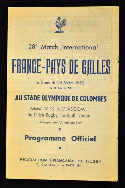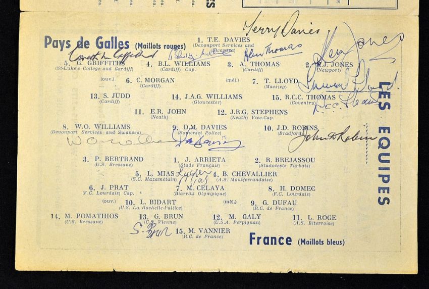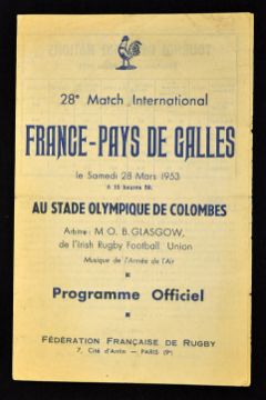 Scarce 1953 France v Wales signed rugby programme - played at The Olympic Stadium Colombes on Saturday 28th March - single folded sheet signed by 10 Welsh players to include Terry Davies, Gareth Griffiths, Bleddyn Williams, together with 2 French players L Mias and G Brun - some slight discolouration and minor nicks to the edges otherwise overall (F/G)