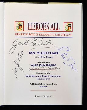 1997 British Lions signed book - titled "Heroes All - The Official Book of The Lions in South Africa 1997" 1st ed 1997 signed to the title page by Willie John McBride, Ian Robertson, Gareth Chilcott, and Chris Morgan complete with the original dust jacket some slight creases otherwise overall (G)
