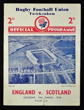 1938 England v Scotland (Champions) rugby programme the last match of the campaign played on March 19 saw Scotland beat England 21-16 and to go on to win The Championship and Triple Crown - with a centre fold ,a small tear to cover and some marks to one inside page (F/G)