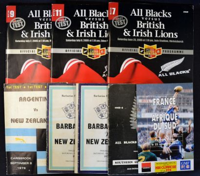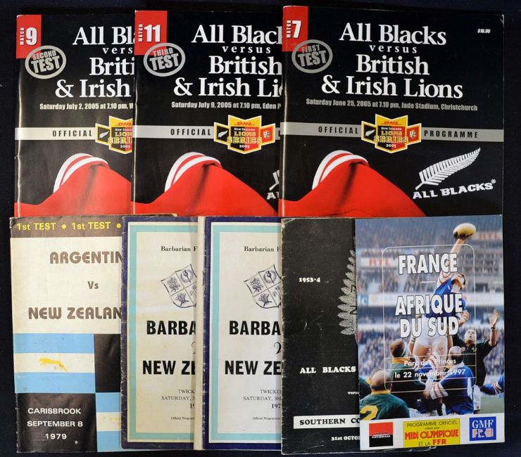 Interesting cross-section of New Zealand "All Blacks" rugby tour programmes from 1953 onwards to include Southern Counties vs The All Blacks '53 and '63, 2x vs The Barbarians played at Twickenham '74, Argentina vs New Zealand XV played at Carisbrook on 8 September '79 and 3x Test Matches vs the British Lions 2005 (F/G), plus 1997 France vs South Africa (9)
