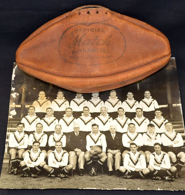 1946 Official British Isles v Australia signed rugby league match ball - original "The Match" four panel ball inscribed to the one panel in ink "Australia Tour 1946" - signatures now faded - less laces and rubber inner tube together with large press team photograph with Risman holding the "The Match" rugby league ball - overall 11.75" x 14.5" - some scuffing, minor nicks and creases to edges (2) Note British Isles team retained the Ashes, drawing the first Test and winning the other two Tests to become the only touring side to remain unbeaten on a tour of Australia.