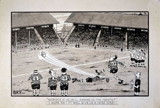 Original rugby pen and ink signed sketch by Bryant - c/w legend below inscribed "Wonder if he will award us the points?" and "I hope so - it will give us a head start!" overall