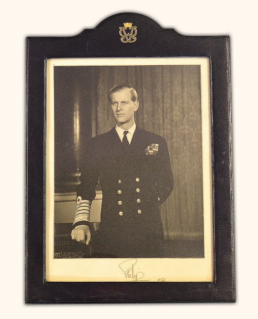 Royalty Elizabeth II Queen of England and Prince Phillip Duke of Edinburgh Signed Photograph displays signed below to the mount 'Elizabeth R 1953' and 'Phillip 1953', mounted, framed and glazed in contemporary blue morocco frame, with royal monogram to top centre with the maker's mark HH Plante London to the rear, this year Queen Elizabeth became Britain's longest reigning monarch of 63 years, a superb tribute and example depicting her early years after her accession in 1952, together with a handsome formal photograph depicting Prince Phillip in Uniform, overall size 25.5 x 36cm (2)