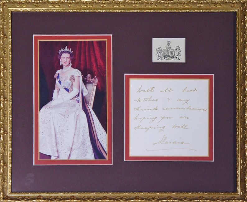 Royalty HRH Princess Marina of Greece and Denmark signed photograph display later Duchess of Kent, wife of Prince George, Duke of Kent, seated wearing Girandole earrings with Tiara, a hand written 'Best Wishes' note with signature, mounted, framed and glazed, overall measurement 35.5 x 30cm, in very good condition