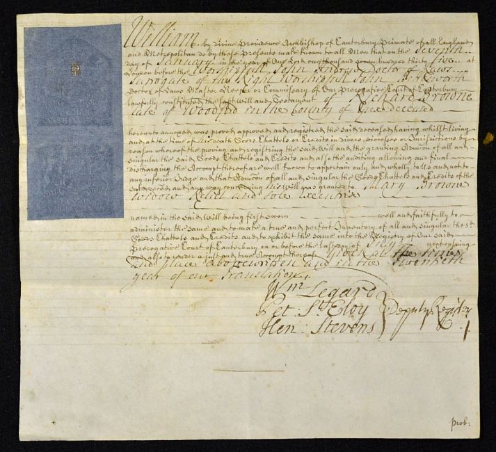 Interesting Manuscript Document Issued by the Archbishop of Canterbury 1735 confirming Mary Brown the widow of Richard Brown late of Woodford in the County of Essex all his goods and chattels (he being the former Vicar there). Also with two 5 shilling revenue stamps, in good condition, size 20 x 19cm