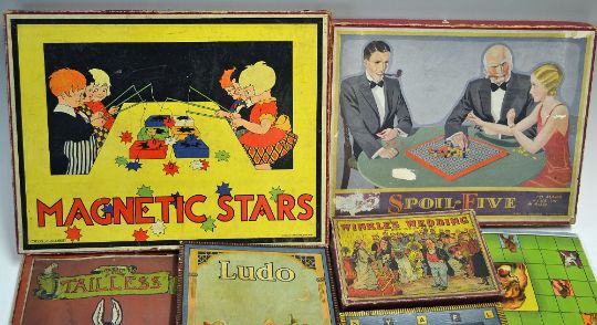 Selection of early Chad Valley board games to include 1909 Tailless Donkey, Winkles Wedding, Steeple Chase Game, Magnetic Stars, Spoil Five, Ring-O-Winks, Ludo, Word Making & Taking and Hoo-Zoo Board game. (9)
