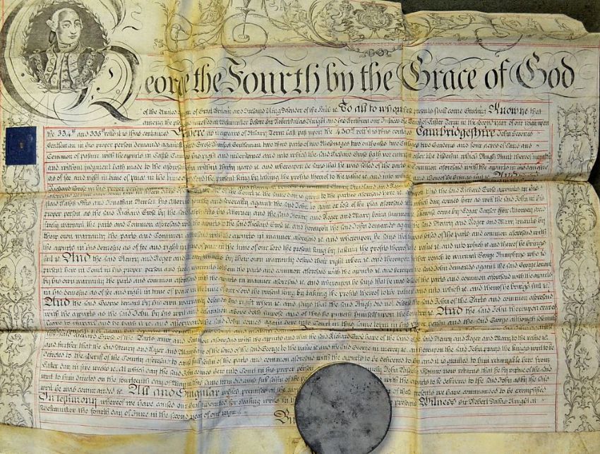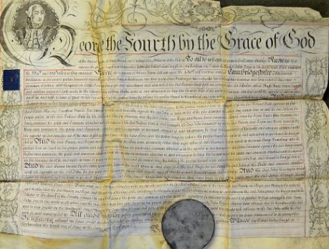 George IV Recovery Deed Document c1820 Cambridgeshire with ornate portrait, capital letter, heading and border, relating to J Scoones and G Burfoot in relation to two third parts messuages, two outhouses, two gardens, four acres of land and common pasture, with large attached seal (crumbled), overall size 79 x 63cm, with heavy folds, some fading and wear to ink, text still clear, overall A/G