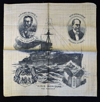 WWI HMS Iron Duke Battleship The Flagship (fought at Battle of Jutland) c1916 an Impressive illustration of the Ship with portraits of King George V and President Poincare of France. Patriotic item printed on cloth, size 33 x 33cm