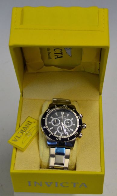Original Men's Invicta Men's 1203 II Collection Chronograph Stainless Steel Watch with Link Bracelet Black-dial watch featuring coin-edge unidirectional bezel, date window at 4 o'clock, and chronograph functions with 60 -second, 30-minute and 12-hour sub dials, 45 mm stainless steel case with Flame Fusion crystal dial window, Swiss quartz movement with analogue display, stainless steel link bracelet with fold-over clasp, water resistant to 100 m (330 ft) new boxed with booklet