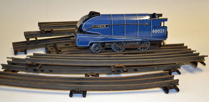 Chad Valley 'Merlin' 0 Gauge tinplate locomotive with a 2-4-0 wheel arrangement, battery operated, in used condition, not tested, 20cm long, t/w a selection of track
