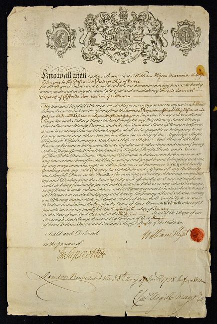 Privateer Official Admiralty Document 1758 during the 7 years' War against France manuscript annotations that 'William Higson belonging to the DEFIANCE Private Ship of War do Constitute my Friend Samuel Tapscott of Chiffords Inn London My true and Lawfull Attorney all Prize Money' etc. With 1/6d revenue stamp top left. Signed by William Higson, Samuel Tapscott & Charles Asgill Dyer (Captain of the ship.) size 20 x 32cm. Report in Newspaper articles of 1758, generally good, some minor tears. Note: Yesterday fell down to Gravesend, in order to proceed on a Cruise, the Defiance Privateer, Capt. Alexander Dickie, reckoned the compleatest Privateer of her Size that bas sailed from the River, this War. The Derby Mercury. June 15th 1758. The Johannah, Goodfellow, from Bergen, is retaken by the Defiance Privateer, and sent into Hull. July 1758. Yesterday Morning an Express arrived from Falmouth, with Advice, that the Defiance Privateer, lately commanded by Capt. Dyer, but now by his First Lieutenant, had taken & brought in there, after an obstinate Engagement, a French Privateer, called the Provost of Paris, of 14 Nine Pounders, & 325 Men. The Defiance had 22 Six Pounders, & 200 Men. The Engagement lasted 6 Hours, wherein the Defiance had 11 Men killed, & 21 wounded. The Frenchman had 70 Men killed & wounded. This is the second Prize taken by the Defiance this War.