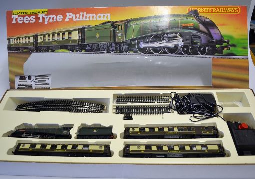 Hornby Railways 00 Gauge R770 'Tees-Tyne Pullman' Train set to include BR Green A4 Class Loco No. 60019 'Bitten', 3x Brown and Cream Pullman cars 'Ansonia', 'Rosemary' and Brake/2nd Car No.77 along track, transformer and controller, appears unused and in very clean condition, box has slight wear otherwise in A/G condition, t/w Hornby Flying Scotsman 00 Gauge R1039 Train set to include 'Flying Scotsman' No. 4472 LNER Loco and tender, t/w 4 x LNER coaches, some track, not complete, general condition appears unused and box is good (2)