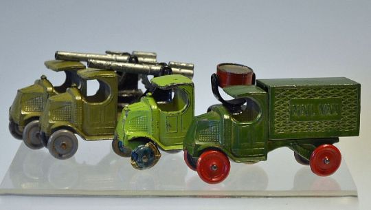 Tootsie Toy Selection of Vehicles c1920 on Mack truck Chassis, to include Mail Van with metal wheels, in good condition, 2x Anti Air-craft Gun vehicles with metal wheels and a Mobile Searchlight with perished wheels but otherwise good (4)