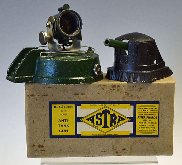 Astra-Pharos Ltd of London c1950s Diecast Fort Gun a cap firing gun, with wooden slug bullets, in very good condition, c/w original Astra-Pharos box but on intended for Anti-Tank Gun, t/w round based searchlight in good condition with no lens or box (2)