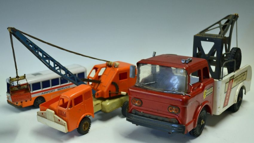 Marx large pressed steel Lorrie Powerhouse Breakdown Truck complete with Chain and Hook retaining decals to body together with Gama Crane and Airport Bus (3)