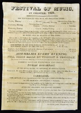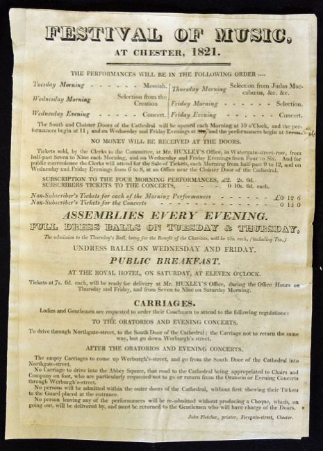 1821 Music Festival Poster at Chester Advertising 6 Concerts in the Cathedral mostly of Handel's music (after the style of the Great Concerts of the period in Westminster Abbey). Tickets being 12/6d and 15 Shillings. Also two Full Dress Balls etc. All in aid of the Local Charities. Detailed black letter press printing by John Fletcher, printer, Foregate Street, Chester, over, minor wear throughout otherwise in good clean condition, overall 19 x 26cm
