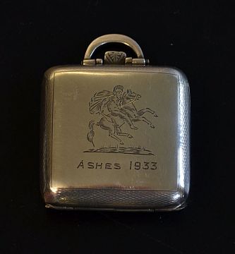 1932/33 England Cricket Tour to Australia engraved silver cased travelling clock - hallmarked Birmingham 1932 and engraved the one panel with the St George's crest and inscribed below "Ashes 1933" and on the opposite panel engraved with a Kangaroo and inscribed above "H Sutcliffe" and below "From Percy" (Holmes) c/w suspension ring and still in full working order - overall 1.5x 1.5" (G) Personal gift given by Holmes to Sutcliffe for the tour to Australia. Note Percy Holmes (England & Yorkshire) with Herbert Sutcliffe formed for fifteen seasons the most prolific opening partnership in first-class cricket, 69 times they put on 100 runs or more for the first wicket. Their partnership culminated, in 1932 against Essex at Leyton, in a then-world-record stand of 555, beating the previous Yorkshire (and world) record by Brown and Tunnicliffe in 1898 by just one run which remained the world-record first-wicket partnership for 44 years. It is still the highest partnership for any wicket in English domestic cricket, and the fifth-highest ever for any wicket in the world. See lot with regards to the score card. IMPORTANT AMENDMENT TO LOT DESCRIPTION - brought to our attention by the Assistant Curator (Collections) at the National Sports Museum and Melbourne Cricket Club in Australia - please note the inscription inscription at the bottom isn’t ‘from Percy’, but rather ‘from Fergy’. William Ferguson was a well known scorer and kit man for both Australia and England, amongst others, for over fifty years, and is credited with inventing to wagon wheel method of scoring. He was also the official scorer and baggage handler of the England team during the 1932/33 tour to Australia. The National Sports Museum and Melbourne Cricket Club have an identical travel clock in their collection presented to P F Warner.