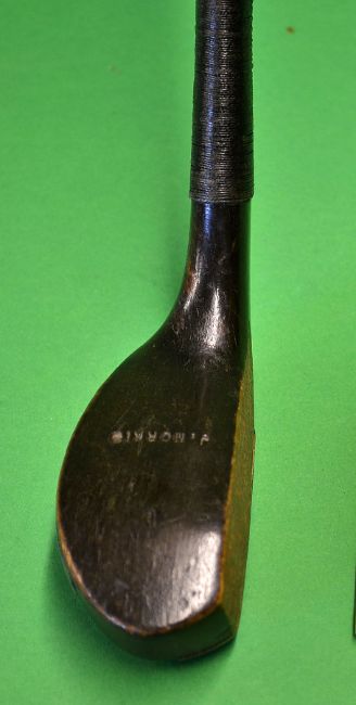 A fine J Morris transitional deep faced dark stained beech wood scare neck putter c1890 c/w 3x circular lead weight to the sole and the original fine full length hide grip and thickened underlisting