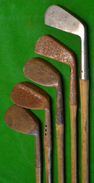 5x various irons - all in need of restoration to incl Winton iron, Maxwell niblick, Logan's Genii model mashie niblick, another niblick and a mid-iron stamped L - 1 needs new grip