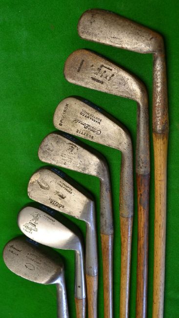7x assorted golf irons to include driving iron, a mid iron, mashies, jigger, mashie niblick and niblicks - makers T Tate St Andrews, Tom Stewart, A Patrick Edinburgh, C McDonald, Forgan Crown et al