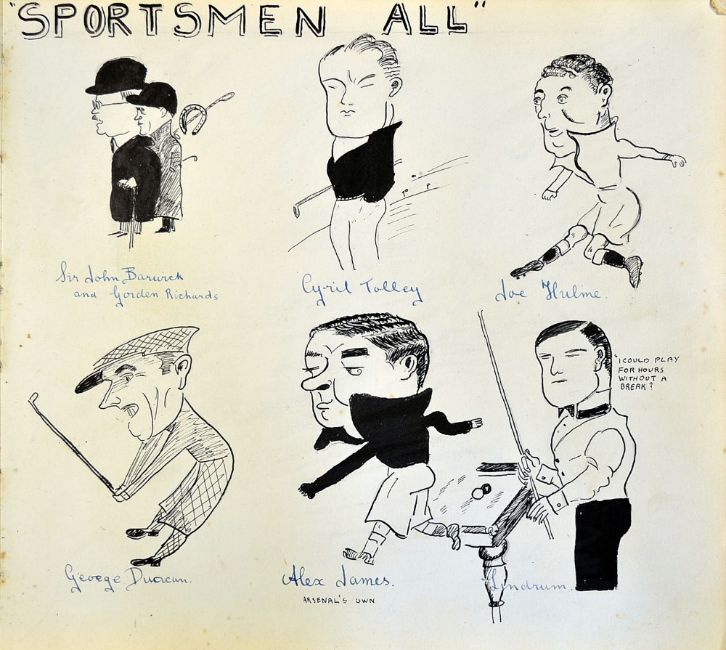 1935 artist album titled and signed "Spare Moments" c/w large collection of hand drawn Percy Fender, would fall, Patsy Hendren, Len Harvey, Max bear, figures of the day to incl sporting personalities, stage and screen, political, movie stars, musicals, singing artists, who's who, European leaders, etchings of London, sporting scenes and characters and much more - sporting figures incl cricketers Percy Chapman, Woodfull, Larwood, Wyatt, Hendren, Fender, boxers Len Harvey and Max Baer, golfers George Duncan & Cyril Tolley, footballers Alex James, Gallacher, Rugby Joe Hulme billiards Lindrum, tennis R Miki, Racing Gordon Richards plus political figures such as Hitler, Ghandi, Churchill, Baldwin, Moseley, Stalin, Mussolini, Lloyd George, Neville Chamberlain and much much more - overall 10" x 11"