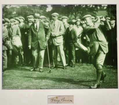 Harry Vardon signed photograph display - comprising a photograph of Braid driving and mounted with a clipped album page signature below - overall 14 x 16"