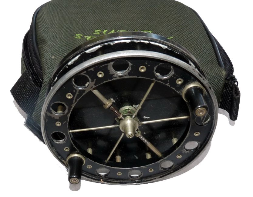 REEL: Allcock's Match Aerial trotting reel, 4.5" diameter, narrow drum, 6 spoke, tension regulator, plated foot, on off check, light paint loss, spins well, c/w zipped reel case.