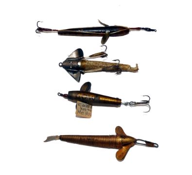 LURES: (4) A rare Wm Brown Patent Serpantanic wire minnow lure, 2" incl. leather tail, gilt finish, fins stamped "WB&S Patent and Serpantanic" a Gow Patent Twin spin minnow, 1.4" long with mount, an early G. Bazin Makers horn minnow, 1.75" long translucent body, metal fins stamped makers details, gut trace with treble and an early sole skin minnow, 2" long body, metal cone head and fins, great lot.
