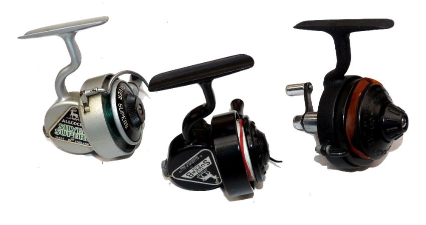 REELS: (3) Allcock's SuperB threadline spinning reel, silver finish LHW, half bail, fine, a similar SuperB in black paint finish and an Allcock's Kastlite reel, coned spool, centre rear crank wind, black crackle finish, three fine examples.