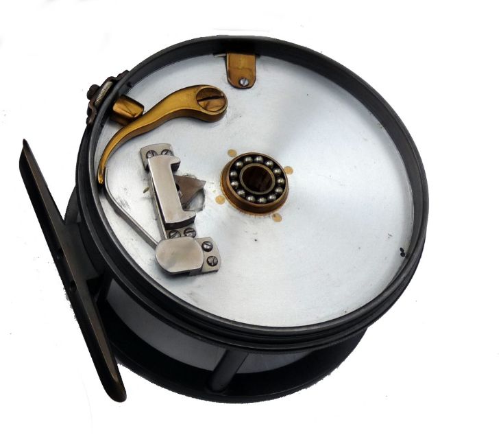 REEL & CASE: Ex rare Hardy Perfect 5" alloy wide drum salmon fly reel fitted with 1912 check, stunning example in little used condition, original white handle, Hardy Bros Alnwick Patent Perfect Reel stamped to winding plate, strapped tension adjuster, Hardy stamped revolving nickel line guide, correct original smooth brass foot, 1912 internal heavy duty check, dished face with two rows of perforations, retains all original dark lead finish in fitted matching Hardy block leather reel case, red baize lined, Hardy address to front, original strap and buckle, initials DJ impressed to lid, superb set.