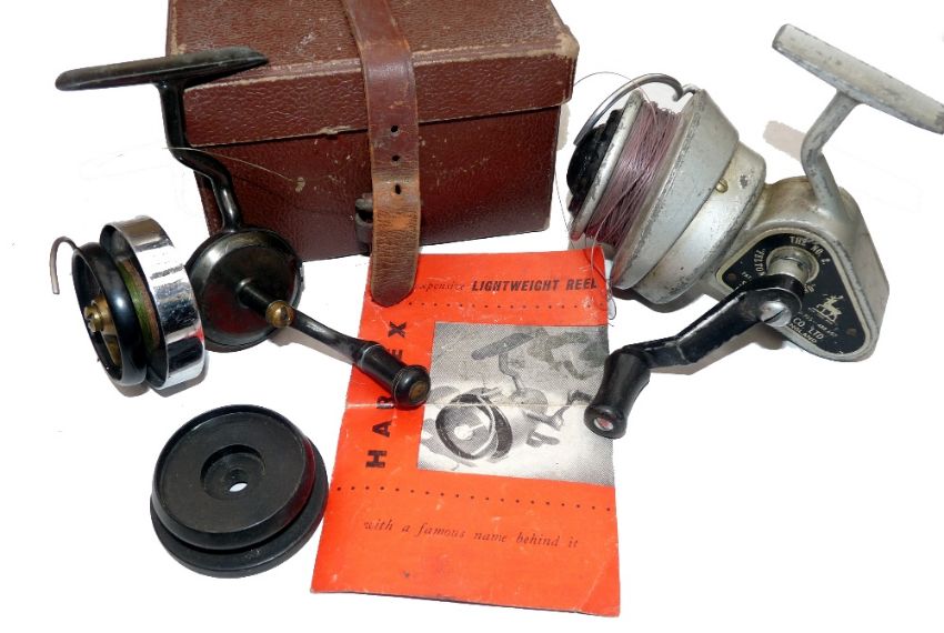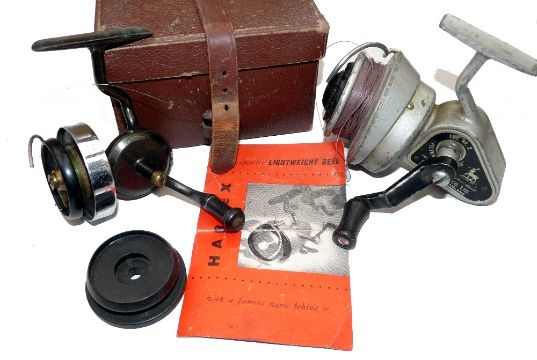 REELS: (2) Hardy Hardex No.1 Mk1 threadline spinning reel, chrome flier, Bakelite spool, half bail arm, retains good original finish, c/w spare spool and brown fibre box and an Allcock No.2 Felton Crosswind, silver finish, triangular gear case, working well.