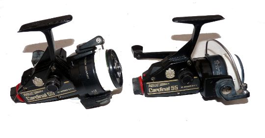 REELS: (2) Pair of classic Abu Garcia Sweden Cardinal 55 spinning reels, both with silent anti reverse, left or RHW, rear drags working fine, good snap to bale arms, both as new.