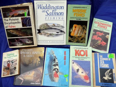 Baker, J - "Modern Barbel Baits And Tactics" 1st ed 2001 S/b, Waddington, R - "Waddington On Salmon" 1st ed 1991, H/b, D/j, 3 x Fishkeepers Guides, Koi, Marine Fishes and Cold Water Fishes plus 3 others by Harris, Davies and Takeshita.(9)
