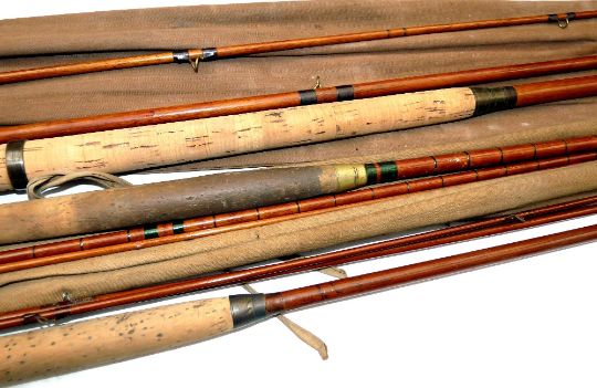 RODS: (3) Farlow of London 13'6" 3 piece greenheart salmon fly rod, recently refurbished, black whipped snake guides, bronze ferrules, wood stoppers, 24" sheet cork handle with bronze sliding reel rings, a Hardy The Alnwick Greenheart 10' 3 piece trout fly rod, lacking butt guide, burgundy whipped FOB intermediates, early sheet cork handle, a/f and a further Hardy greenheart fly rod, lacking ferrules, for spares and repairs, all in MOBs.