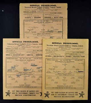 War-time football programmes Tottenham Hotspur v Aldershot 1944/1945 17 February 1945 1945/1946 v Birmingham City 13 October 1945 v Luton Town 19 January 1946. Single sheets, usual minor faults (3)