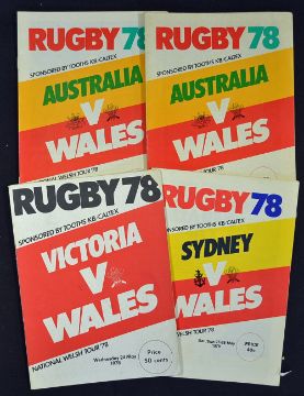 4x 1964 Wales Rugby Tour to Australia mostly signed programmes - to include both the 1st and 2nd test matches vs Australia signed by 6 players to the 2nd test match programme Alan Donovan, Terry Holmes, Graham Price, Di Richards, and John Richardson, vs Victoria signed by 12 Wales players to incl Gareth Davies, Ray Gravell, Lane, Richardson, Jeff Squire, Brynmore Williams, J J Williams and Bobby Windsor et al and v Sidney signed by Dia Richards (Swansea) generally overall (F/G),