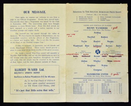 War-time Football League Cup Final 1944/1945 Bolton Wanderers v Manchester Utd football programme at Burnden Park. Team changes, small mark