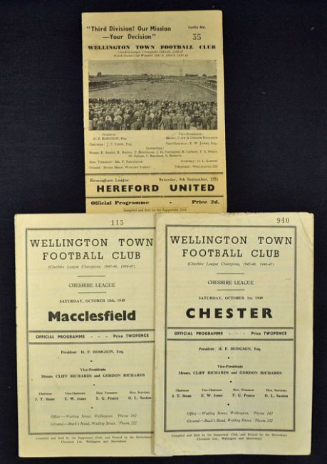 Selection of Wellington Town football programmes to include 1949/1950 v Macclesfield, Chester, 1951/52 Hereford Utd. Slight creases, no writing (3)