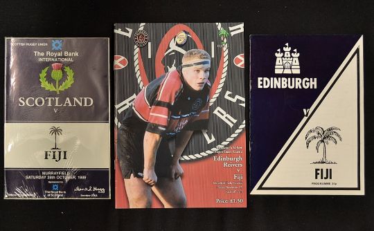 3x 1980s Fiji Rugby Tour to Scotland programmes to include vs Scotland played at Murrayfield Saturday 28th October, vs Edinburgh '82, and v Edinburgh Rievers '98 - (VG)