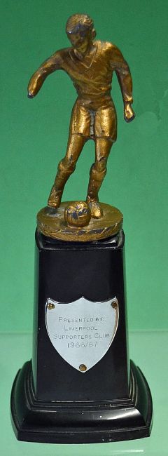 Statuette of a footballer + ball mounted on a black column base, made of base metal and painted bronze, shield shaped silver coloured plaque to the front with the engraving "Presented by Liverpool Supporters Club 1966/67" as an award to Geoff Strong, 205mm x 70mm in size. Minor damage