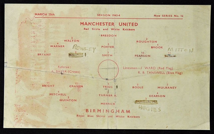 War-time 1943/1944 Manchester Utd v Birmingham City war cup football programme played at Maine Road match programme. Fold, slight marks team changes