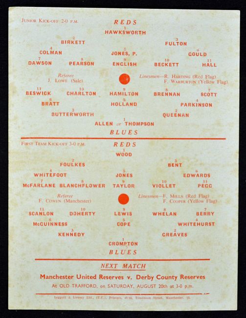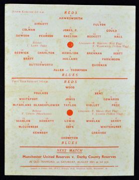 Scarce Manchester United Public Trial Matches 1955 at Old Trafford dated 13 August 1955, covers two trial games seniors and juniors, Duncan Edwards in the senior game. Single sheet, good.