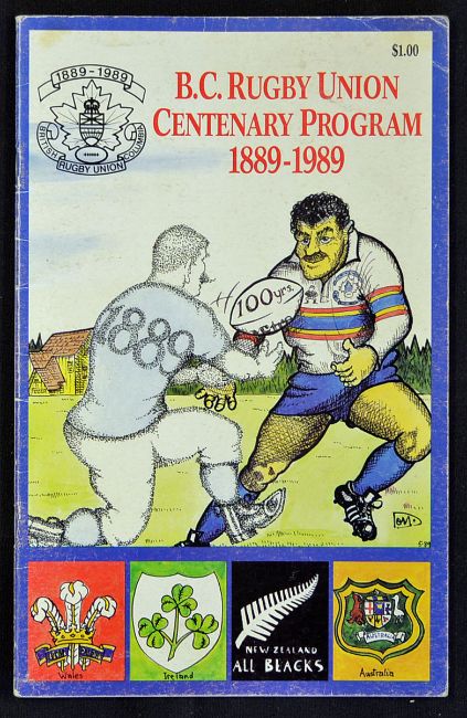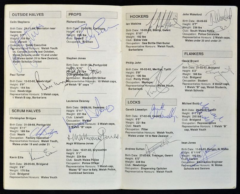 1989 Wales Rugby tour to British Columbia signed rugby programme - to celebrate British Colombia rugby union centenary and signed by the entire 26x Welsh team to their player profiles to include Paul Thorburn, Arthur Emma, Stephen Ford, Mark Ring, Ceri Jones, Stephen Jones, Gareth Llewellyn, Michael Budd, et al - overall (G)