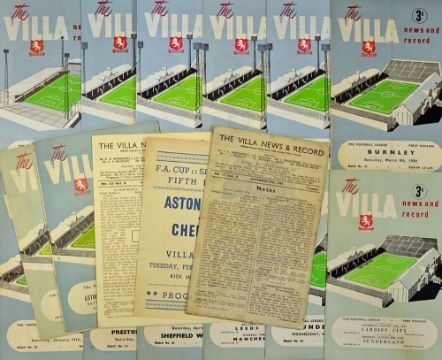 Selection of Aston Villa home programmes to include 1945/1946 West Ham Utd, Chelsea (FAC-pirate), 1946/1947 Liverpool 1949/1950 Newcastle Utd 1952/1953 Derby County 1955/1956 Cardiff City/Sunderland 1956/1957 Sunderland, Leeds Utd/Manchester City 1957/1958 Sheffield Wednesday, Preston NE, Sunderland, Burnley 1959/1960 Preston NE (FAC), 1960/1961 Fulham, Wolves/Bolton Reserves 1962/1963 Wolves/Wolves Reserves 1963/1964 Sheffield Utd. Fair-good (17)