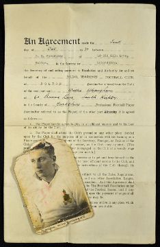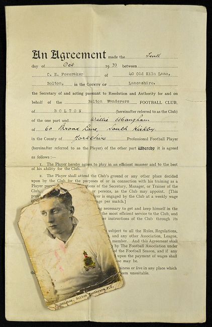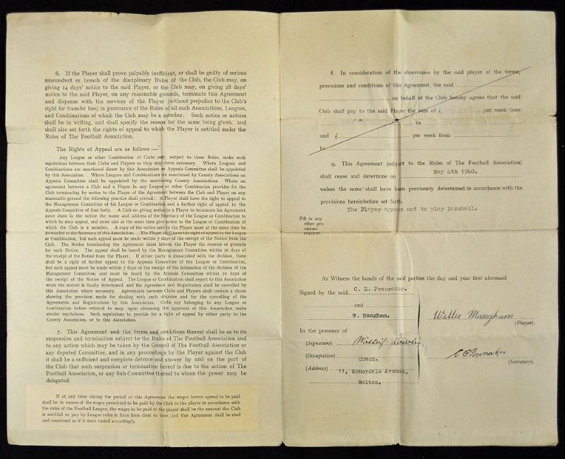 Abandoned season 1939/1940 Player Contract dated 10 October 1939 between Bolton Wanderers and William Maughan for the period to 4 May 1940. Signed by C E Foweraker (Manager), Walter Rowley (Coach) and Willie Maughan (Player), folds (kept flat), otherwise good. Note: It has a provision clause: The player will not play baseball.