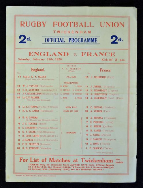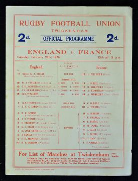 1928 England (Champions) v France rugby programme played 25th February at Twickenham, England winning 18-8, Grand Slam and Triple Crown winners, single sheet, with heavy centre folds, some foxing, small tears to edges, otherwise clean example